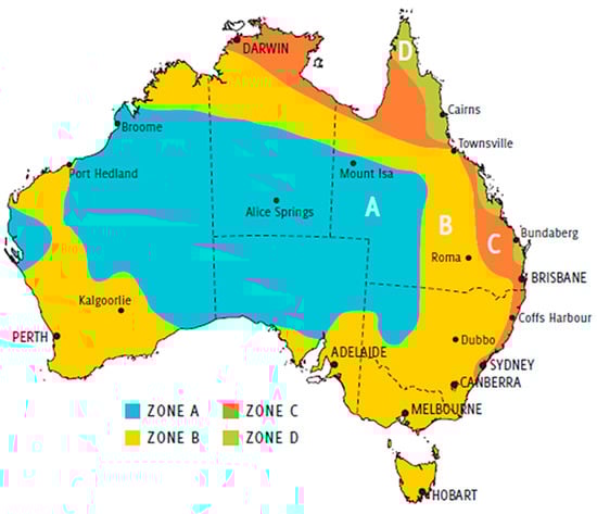 In-ground decay hazard map of the continent of Australia delineating relative vulnerability to attack by decay fungi (Zone D has the greatest in-ground decay hazard). Image used with permission from [].