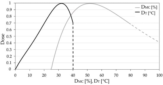 Over numerous articles, a factorization approach to modelling wood service-life using the dose–response concept was suggested [,,,]. A logistic dose–response model presented in Brischke and Rapp [], was used to describe the relationship between wood moisture content (MCwood), wood temperature, and the resultant wood decay. The model was first developed to describe the development of fungal decay and the corresponding aboveground exposure conditions and follows the physiological requirements (temperature and moisture) of wood-decaying fungi. The total daily dose was assumed to be a function of the moisture- and temperature-induced components (Figure 2). The cumulative total daily dose was calculated as the sum of total daily doses for a certain exposure period ( days), shown by Equation (2).