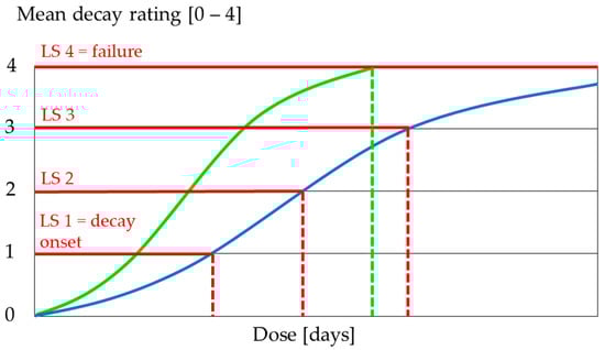 Example relationship between cumulative total dose measured in days and mean decay rating according to EN 252:2015 [] for wood specimens exposed aboveground. LS = limit state; green curve = wooden element exposed in-ground; blue curve = wooden element exposed aboveground. Graph adapted from Brischke and Frühwald Hansson [].