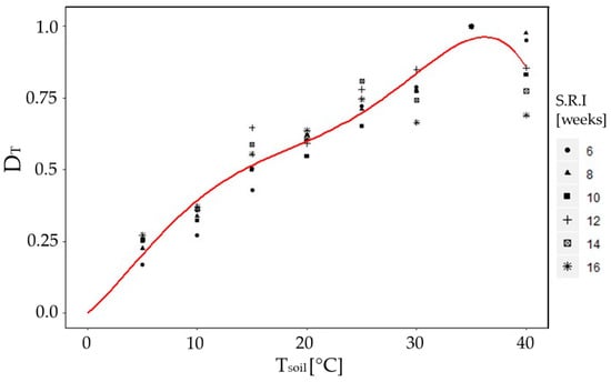 Soil temperature (Tsoil) plotted against dose to show the temperature-induced dose component model for European beech wood exposed to soil contact. The red line is a polynomial function fitted using the OLS optimization procedure. R2 = 0.9888. S.R.I. = specimen removal interval measured in weeks.