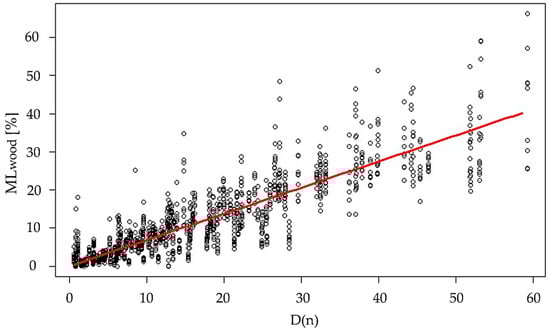 Equations (9)–(11) present the model for cumulative total daily dose where the sum of total daily doses consisting of moisture- and temperature-induced components, for a given exposure period, can deliver an expected wood decay (MLwood) value. The input data and linear regression function developed for cumulative total daily dose are represented graphically in Figure 5. It also shows the clear problem of heteroscedasticity of the residuals, that with increasing dose days, MLwood shows an increased range between minimum and maximum values. Maximum likelihood optimization techniques (which included a variance model) were subsequently used to deliver the linear model of Equation (11).