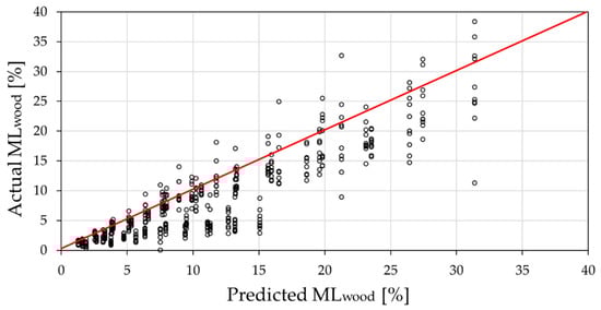 Figure 6 below shows the results from the model validation procedure whereby the predictive accuracy of the cumulative total daily dose model of Equation (11) was assessed. A subset of data describing MLwood for alternating temperature-induced conditions taken from Part 1 [] was used. The data was independent of that used to construct the model of Equation (11), but described soil conditions with similar moisture conditions. The data points in Figure 6 represent actual MLwood values on the Y-axis and their predicted MLwood values on the X-axis. The red line represents an ideal, 1:1 relationship of the model’s prediction accuracy, meaning that the model is currently overpredicting MLwood since most of the points are situated beneath the red line. Underprediction of MLwood would see most of the points situated above the red line, while ideal prediction accuracy would see all the points situated closely to the red line (slightly above and/or below), across the whole prediction range. Residuals from the red line to the predicted values were used to calculate a “goodness-of-fit” criteria (R2 = 0.66).