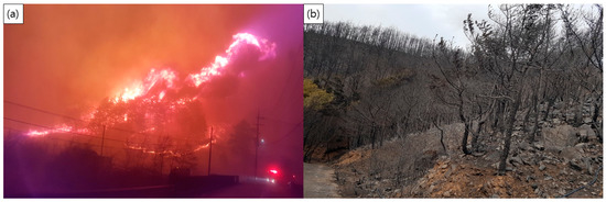 (a) Front line of the spreading forest fire in Okgye forest on 4 April 2019 (photograph by Gangwon Province), and (b) severely burned Okgye forest three days after the fire (photograph by East Coastal Forest Fire Center of Gangwon Province).