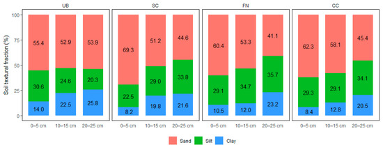 Variations of mean (n = 3) soil textural fractions (%) with vegetation burn severity (UB, SC, FN, CC).