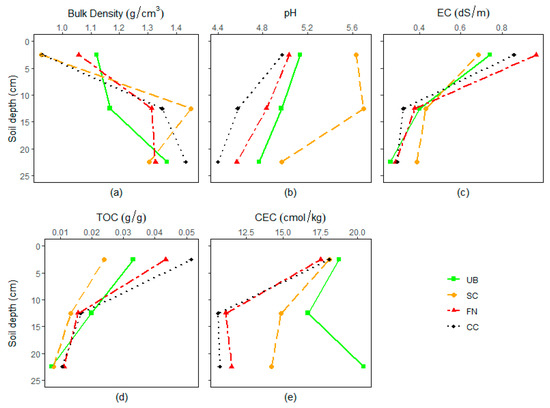 Differences in soil properties (bulk density, pH, EC, TOC, CEC) with vegetation burn severity (UB, SC, FN, CC) and soil depth (0–5 cm, 10–15 cm, 20–25 cm).