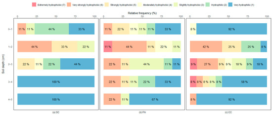 Table 2 showed that the proportions of hydrophobic soils (MED classes 3–7) at the top surface (0–1 cm) were 22% for SC, 56% for FN, and 8% for CC (p < 0.1). At 1–2 cm depth, the proportion of hydrophobic soils for CC was significantly lower than for SC and FN (Fisher’s exact test, p = 0.027). Approximately 100%, 100%, and 67% of sites for SC, FN, and CC, respectively, were hydrophobic. At 2–3 cm depth, the proportion of hydrophobic soils decreased for SC and FN, whilst it decreased at 3–4 cm for CC.