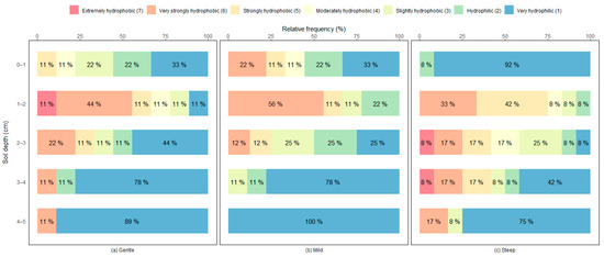 Relative frequency (%) of water repellency classes by soil depths, which were measured by MED tests at different slope gradient groups: (a) gentle, (b) mild, and (c) steep slopes.