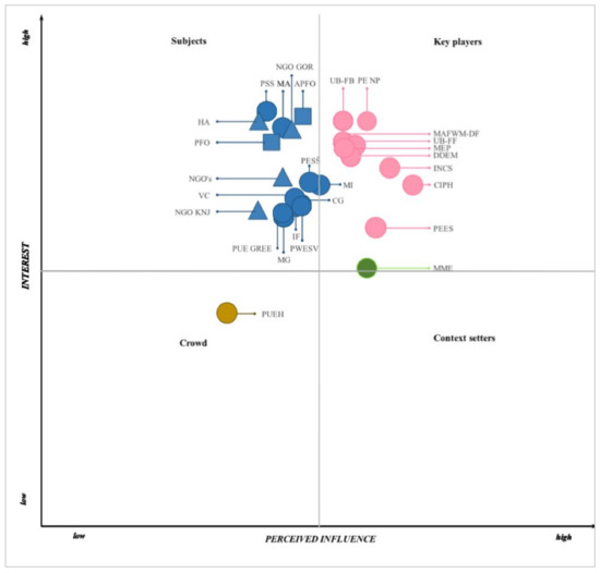 Stakeholders are distributed in a (two-dimensional) coordinate system in one of four quadrants and classified as “subjects”, “key players”, “crowd”, and “context setters” [52,80,90]. Stakeholders in the “subjects” and “key players” quadrant have the most interest in the issues at stake or the related context, while the stakeholders in the “key players” quadrant have more perceived influence in supporting (or not supporting) the issues at stake compared to the “subjects”. The stakeholders in the “context setters” quadrant do not have much interest but may have sufficient perceived influence over the issues at stake, while the stakeholders in the “crowd” quadrant have neither the interest nor the perceived influence on associated context and its outcome [90].