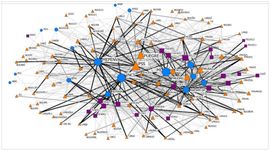 Collaboration network in climate change governance in forestry and nature conservation. A graph is in multidimensional scaling layout (MDS) as defined by UCINET. More connected organizations are displayed close to each other; orientation (left–right; top–bottom) is arbitrary. The shape and color of the organizational symbol reflect governance level (national level—circle, blue color; regional level—square, purple color; local level—triangle, orange color). The size of the organizational symbol and label is in proportion to the results of their tie range. Tie thickness and color are scaled according to the frequency of contacts. The highest tie thickness in black color represents daily and weekly contact frequency, highest thickness in grey color represents monthly contact, whereas thin grey ties represent quartal and yearly frequency of contact.