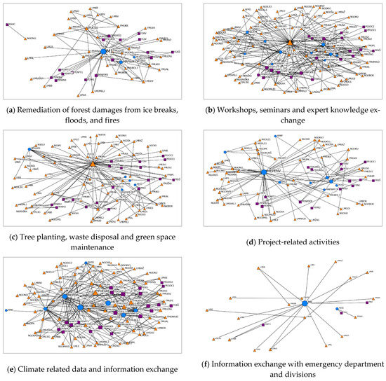 All 103 respondents indicated other stakeholders with which they collaborate. Of the 27 stakeholders reported, collaboration with City Institutes for Public Health (CIPH) and Private Forest Owners (PFOs) is not specified. Consequently, SNA resulted in a collaboration network consisting of 128 stakeholders from the public and civil sectors from all governance levels (national, regional and local). The list of all stakeholders is in Table A3 and Table A4.