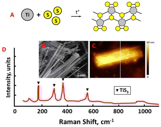 TiS3 nanoribbons synthesis and sample characterization: (A) reaction scheme, (B) SEM image, (C) AFM image, (D) Raman spectra.