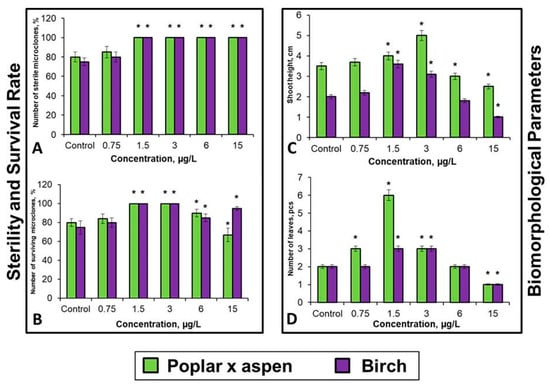 Biomorphological parameters of the microclones at the initiation stage: (A) Mean number of sterile microclones; (B) Mean number of survival microclones; (C) Mean shoot height; (D) Mean number of leaves (hereinafter the height of the column corresponds to the mean value, bar—to the standard deviation, * is significant deviation from control).