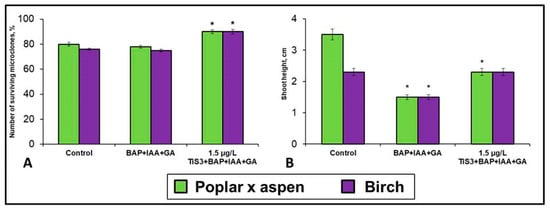As one can see from Figure 3A, the nanomaterial introduced into the growth medium increased the microclones survival rate. In the TiS3-treated groups, poplar and birch survival rate was 90%, exceeding the control values by 10% and 14%, respectively. In the nanomaterial-free variant, the survival rate was below the control values by 1–2%. In the nanomaterial-free medium, we observed the lowest height increment (Figure 3B). More specifically, the heights were 1.5 cm for both hybrid poplar and birch microclones, as compared to 3.5 and 2.3 cm in the control groups. When we added the nanomaterial, we still observed the suppressive impact on the hybrid poplar, though it was less evident than in the previous case. The height of birch microclones in the TiS3-treated group was not significantly different from the control.