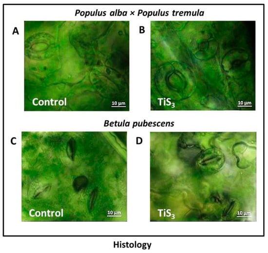 Histological examination of poplar × aspen hybrid microclones leaves (Figure 4) revealed an increase in the area and in degree of stomatal opening in the TiS3-treated group against lower stomatal area and density in the control group. Most probably, the observed increase in the stomatal opening area and degree of stomatal opening compensates for the lower number of stomata per unit area.