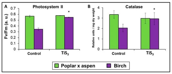 The analysis of photosystem II and enzyme activity revealed no significant effects of titanium trisulfide upon the studied parameters in poplar × aspen hybrid microclones (Figure 5). At the same time, the birch regenerants displayed a large rise in photosystem II activity—0.55 units as compared to 0.34 units in the control group (Figure 5A)—and catalase activity—2.94 units/mg dry weight compared to 2.05 units/mg dry weight in control (Figure 5B).