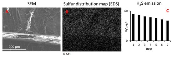 (A) SEM image of birch root sample homogenate (1.5 μg/L TiS3-exposed group), (B) EDS sulfur distribution map, (C) emission of hydrogen sulfide from titanium trisulfide nanoribbons in bidistilled water for 7 days.