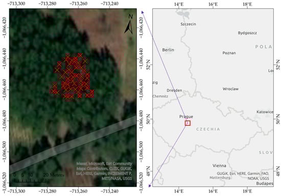 The experiment was conducted in the School of Forest Enterprise of the Czech University of Life Sciences (ČZU Prague) in Kostelec and Černými Lesy (Figure 1). The study area extends geographically from 49°54′50.19′′ N; 14°52′23.61′′ E to 49°54′50.12′′ N; 14°52′24.98′′ E., with an area of 25 m2 (25 × 25 m). In terms of species composition, the area is dominated by Norway spruce (Picea abies (L.) H. Karst.). The expanded area is mainly characterized by managed, even-aged forests with an age of about 60 years. In addition, artificial branch pruning has been carried out in the past for the lower portions of trees. The terrain profile in the area is gently sloping, with an elevation of about 420 m ASL, a mean annual temperature of 7.5 °C, and a mean annual precipitation of 600 mm.