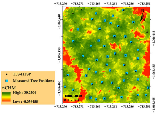 Normalized canopy height model (nCHM) and the stem locations. Unprocessed trees in the upper-left and -right corners are not part of this study.