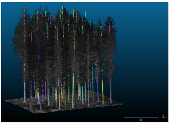 We used the RANSAC method [22] in CloudCompare for point cloud shape determination of stems, as shown in Figure 3. In the general parameter settings tab of RANSAC shape detection, we used cylinder as the primitive and set 500 as the minimum number of support points per cylinder. In the advanced parameter settings, based on the size of each stem, we used maximum distance to the cylinder (e = default values), sampling resolution (b = default values), maximum normal deviation (a = default), and overlook probability (default). Once the algorithm iterated through all the stems, the total length (above the ground to the treetop) was extracted for each colored cylinder.