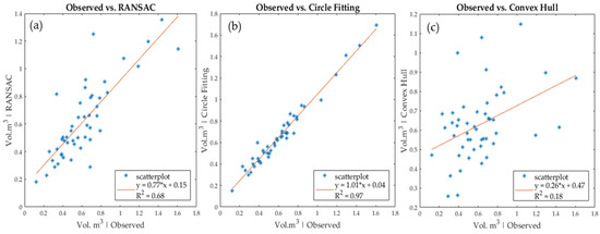 Linear regression models of the observed and estimated total stem volume between the three used approaches. (a) shows the volume correlation between observed and RANSAC, (b) shows the volume correlation between observed and circle fitting, and (c) shows the volume correlation between observed and convex hull.