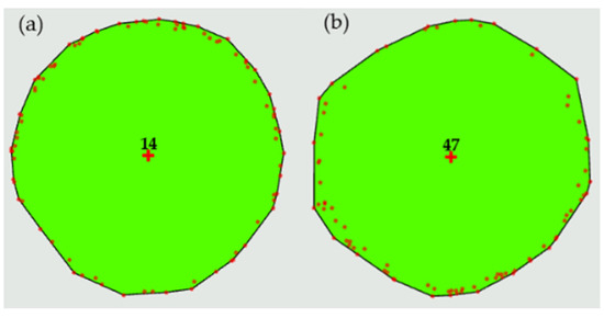 The deviation of stem shape profile from the regular circular shape, for a circularity of (a) 0.986, and (b) 0.974. The red points represent the TLS data, and the continuous black line represents the convex hull circumference. The numbers in the center represent the stem code ID.