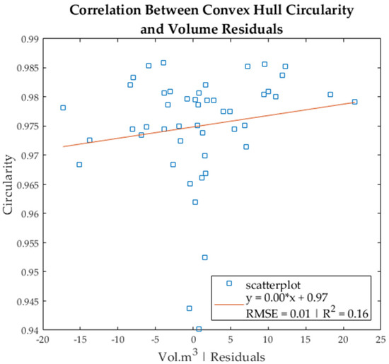 Correlation between the circularity (deviation of stem shape profile from regular circle) and the produced volume residuals (observed vs. convex hull).