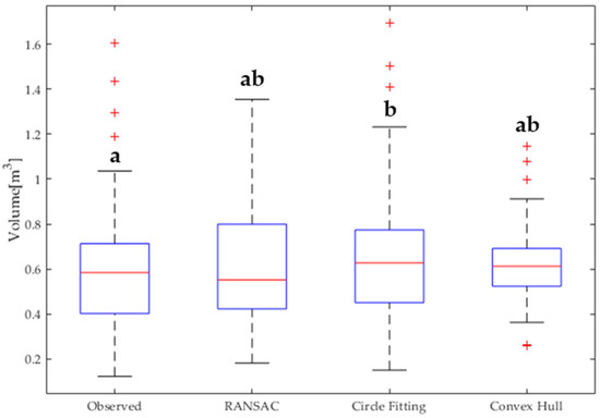 Box and whisker plots of the observed and estimated total stem volume. The letters (a and b) indicate whether or not there were significant differences between the groups at a 0.05 significance level.