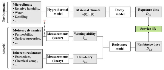 The performance-based framework used for above-ground applications as basis for the CLICKdesign approach is illustrated in Figure 1. The service life of wood here depends on the exposure dose, DEd, and the resistance dose, DRd. The former is derived from the variation in moisture content, u, and temperature, T, of the material (material climate), and the latter is derived from the inherent properties of the material, including both moisture dynamics (wetting ability) and inherent resistance (natural, modified or treated) to fungal decay [20,21]. Wood moisture content depends on the microclimate at the wood surface (relative humidity, temperature, presence of water etc.) and the inherent moisture dynamics (permeability, surface properties etc.) of the material, where the former can be regarded as boundary conditions and the latter affects the amount of water being transported deeper into the bulk of the wood. Due to limitations in existing moisture models as well as due to practical aspects, the link between moisture dynamics and material climate is not explicitly considered, as indicated by the broken link in Figure 1. Instead, the effect of moisture dynamics on service life is considered by the resistance model [20,21]. The material climate can thus be regarded as a reference case based on the moisture dynamics of the Norway spruce (Picea abies). Modelling the reference material climate is a fundamental part of performance-based design.