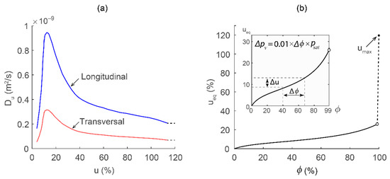 where EA (J/mol) is the activation energy, R (J/Kmol) is the universal gas constant, and T (K) is the temperature. The activation energy was obtained from measurements based on [27]. The mass-transfer coefficient kp (kg/m2sPa) was taken from [28]. For simplicity, a constant mass-transfer coefficient was used. When the wood is exposed to liquid water, it is assumed that the outermost wood fibers instantly attain a maximum value of 120% moisture content. The relationship between relative humidity, Φ, and equilibrium moisture content, ueq, is described by the sorption isotherm, which was taken from [24]. The hygroscopic part of the sorption isotherm extended to Φ = 99% and was then interpolated to u = 120% at Φ = 100%. The temperature of the wood surface and air were assumed equal, so the difference in vapor pressure, Δpv, was calculated as the product of the saturation vapor pressure and the difference between the relative humidity of the air and the equilibrium-relative humidity of the wood surface, the latter being obtained from the sorption isotherm.