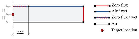 Geometry and boundary conditions used by the FEM. The point used for comparison with the SMM is denoted as target location.