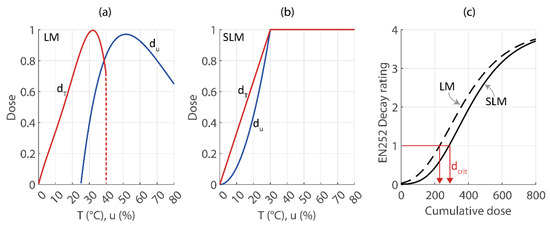 Functions of moisture- and temperature-induced dose shown for the LM (a) and the SLM (b) and the sigmoid functions describing the EN 252 [30] decay rating as a function of cumulative dose (c).