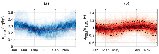 Figure 6a shows the density of daily average moisture content based on the time series of all geographic locations, calculated at the target location (see Figure 4) using the FEM. Figure 6b shows the relative difference between the FEM and the SMM. As seen in Figure 6a, most locations exhibit a similar seasonal variation with higher moisture content during the winter months. At a given day, the moisture content can vary between dry (about 15%) and very moist (about 30%) depending on geographic location. At some locations, the wood remains damp over the entire year. The relative difference between the models shown in Figure 6b is also subject to a small seasonal variation. Although not shown here, this seasonal variation is related to the effect of temperature of the SMM, given by Equation (6), and disappears if this effect is neglected.
