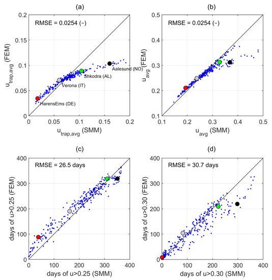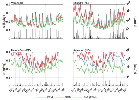 Figure 7 shows the results of both moisture models from four different locations together with the reference moisture variation, uref, calculated using the FEM without any moisture trap. The four locations, Verona (IT), Shkodra (AL), Haren (DE), and Aalesund, (NO) have 30, 87, 99, and 122 days with more than 2 mm precipitation, respectively, and have been selected to demonstrate the effect of precipitation on model performance. Note that the reference moisture content is a common base in both models, so the performance of the SMM is best evaluated in terms of the difference from the reference moisture variation.