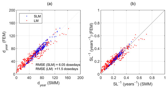 Annual dose, dyear, (a) and the reciprocal of service life, SL−1, (b) in the joint calculated using the FEM and the SMM, respectively.