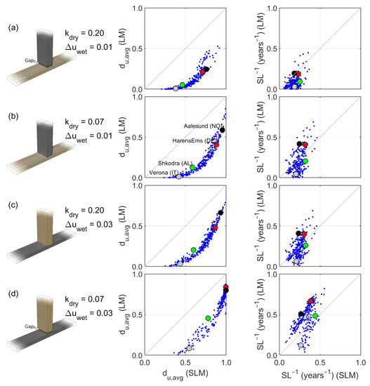 Average annual moisture-induced dose (du,avg) and reciprocal of service life (SL−1) in four different types of moisture traps, calculated using the SMM coupled with the LM and SLM, respectively. From the top: exposed side-grain with gap (a) and without gap (b) and exposed end-grain with gap (c) and without gap (d). Observe that end-grain refers to the vertical member and side-grain to the horizontal member. To the left, the values for kdry and ∆uwet are shown for the investigated member.
