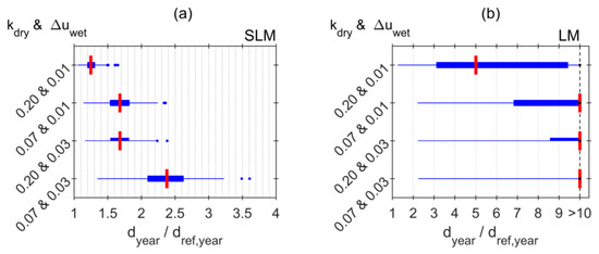 When calculating the service life and thus taking the effect of temperature into account, the difference between the models becomes less clear. At a relatively low degree of moisture trapping (Figure 10a), the moisture content often remains below 25%, resulting in a LM dose of zero and infinite service life. For higher degree of moisture trapping (Figure 10d), the LM generally gives a shorter service life despite the moisture-induced dose being lower than for the SLM. This is due to the higher weight of temperature when combining the temperature- and moisture-induced doses (compare Equations (7) and (8)).