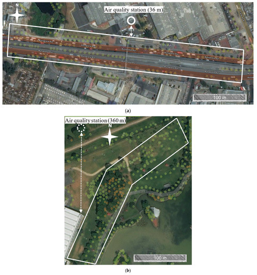 Study sites [24]. (a) Zone 1 = South Highway and (b) Zone 2 = Simón Bolívar Park.