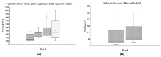 On average for Zone 1, the results suggested that the species Ligustrum lucidum, Eucalyptus ficifolia, Tecoma stans, and Callistemon citrinus had an effective IPMCs of 4302 and 633 µg per exposed leaf, respectively. In Zone 2, the effective IPMCs for the species Quercus humboldtii and Lafoensia acuminata were 3442 and 1820 µg per exposed leaf, respectively (Table 1 and Table 3). Indeed, these differences in the IPMCs were associated with the LAs of each tree species. However, these differences in the IPMCs were possibly also due to the different levels of PM2.5 pollution in the zones under study. Zone 1 showed the highest degree of PM2.5 pollution, and probably because of this, the species located in this area showed the highest effective IPMCs compared to the species in Zone 2.