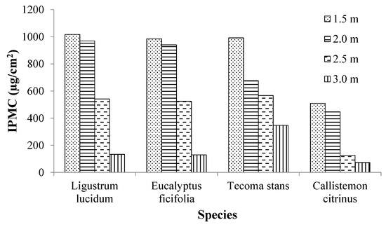 During the study period, leaves were collected at different heights for the four species selected in Zone 1 (between 1.5 and 3.0 m). These leaves were collected in direction of the roadway. The results showed a similar trend in the variation of IPMC with the sampling height for all species. Namely, the largest IPMC was observed for the sampling height closest to the road surface (1.50 m) and subsequently the IPMCs tended to decrease as the sampling height increased (Figure 4). On average, IPMC at 1.50 m was 5.13 times higher compared to IPMC at 3.0 m. In this study, the findings suggested that PM mobile emission sources were possibly located at a height less than or equal to 1.50 m (i.e., vehicle exhaust). The PM from road traffic also comes from other sources such as brake wear, tire wear, and vehicle-induced resuspension of road dust [37]. The results also suggested that the PM resuspension phenomenon had a greater effect for heights less than or equal to 1.50 m, and that it decreased with the height.