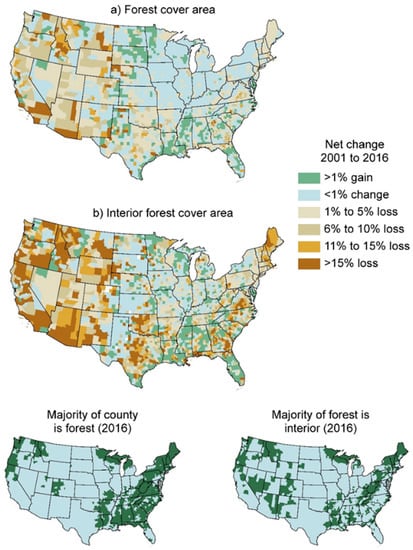 Between 2001 and 2016, the conterminous United States experienced a 2.6 percent net loss of total forest land cover area (Table 1). In comparison, the net loss of interior forest was between 5.0 and 20.7 percent and increased with increasing landscape size (Table 1). Interior forest was lost at higher rates than total forest because the forest losses tended to occur in core and interior areas while the forest gains tended to occur in dominant and subdominant areas [44]. The rates of forest cover loss and fragmentation decreased during the three five-year intervals between 2001 and 2016 but the rate of interior forest loss continued to exceed that of total forest cover (Table 1).