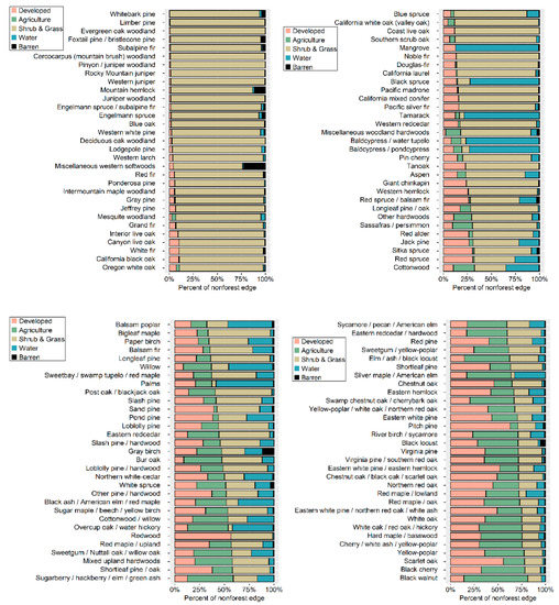 An analysis of forest edge typology [30] has been added as an appendix to the most recent reporting for the Montréal Process fragmentation indictor, providing an example of how indicators may be adjusted and enhanced over time. The analysis addresses differences in the proximate causes of fragmentation where there is evidence of fragmentation. Briefly, individual FIA forest inventory plots are attributed with the types of forest edges that occur in the surrounding neighborhood and FIA statistical estimators are used to summarize the results by forest type (Figure 4). Combining information in that way only characterizes the patterns in the vicinity of a given forest type, but still comes closer to the original Montréal Process definition of the indicator (i.e., as “fragmentation of forest types”). Furthermore, forest edge typology does not characterize the magnitude of fragmentation for different forest types, instead it describes the non-forest cover near FIA plots where the forest cover is fragmented. The results reflect well known regional differences such as the tendencies for forest edge (where it exists) to be associated with shrub and grass land cover in the west (i.e., western forest types), with agriculture and developed land cover in the east (eastern forest types), and with water in riparian or coastal areas (riparian forest types). This information helps to understand the relative importance of different fragmenting agents for different forest types. It also reveals insights such as the large proportion of the forest-developed edge in some relatively remote western forest types (e.g., Sitka spruce and Redwood) and eastern types typical of poor building sites (e.g., Black spruce and Mangrove), which results from roads (a type of development) traversing otherwise unfragmented forests [30]. Still under consideration for the National Report are similar analyses (not shown here) of FIA plots in relation to nearby “core” forest cover to quantify the magnitudes of fragmentation at the forest type level [45], and analyses of plots in relation to nearby “interfaces” with agriculture and developed land to help identify future threats resulting from land use changes [46].