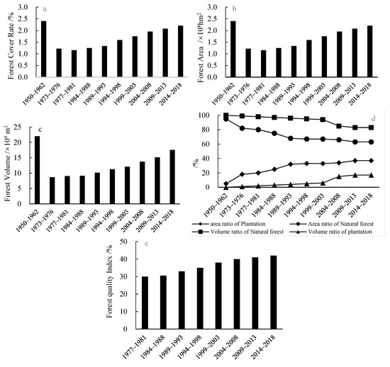 The trends of forest area and forest quality in China from 1950–2018. ((a) is the forest cover rate, (b) is the forest area, (c) is the forest volume, (d) is the origin structure, and (e) is the forest quality index).