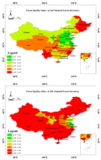 Based on the spatial distribution, the Jilin and Heilongjian province in northeastern China had the highest forest quality indexes from the in 2nd and 9th National Forestry Inventory, because Xing’an Mountains and Changbai Mountain forest areas were concentrated in this region (Figure 2). The forest quality indexes in Sichuan, Chongqing, and Yunan were also high because where include the western Sichuan forest area and the northwestern Yunnan forest area. The forest quality indexes of Fujian, Jiangxi, and Zhejiang along the eastern coast were also high. The forest quality index in Tianjin, Shanghai, and Shandong was low. Ningxia and Gansu have fragile ecologies and forest resources were scarce, so their forest quality indexes were not high.
