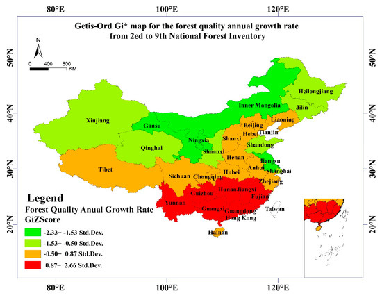 The northwestern semi-arid and arid regions were poorly endowed with forest resources. The precipitation was also low with a considerable number of areas having an average annual precipitation of less than 400 mm [36]. The climatic conditions were not conducive to the reproduction and restoration of forest trees, and the economic development was relatively backward compared to the eastern provinces [52]. Thus, these regions, for example, the Shaanxi, Gansu, Ningxia, Qinghai, Xinjiang, and Inner Mongolia provinces in northwestern China, were cold spots and sub-cold spots for the forest quality growth rate (Figure 2). It should be noted that these provinces were important ecologically fragile areas. Once important key ecological land was destroyed, its recovery was quite difficult [36]. Another reason that these areas were forest quality growth rate cold spots and sub-cold spots is that grassland quality was not statistically considered in the forest quality index. How to incorporate grassland resources into the forest resource inventory and construct a comprehensive index reflecting the total amount of forest and grassland resources should be considered in future resource inventory studies.