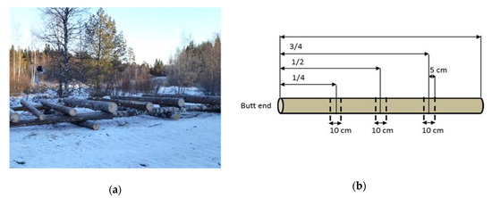 (a) The setup for the saw log storage study. The image was taken at the beginning of the winter study. (b) Figure indicating the location of the three sample discs cut from each sample log.