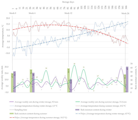 Average ambient temperatures and weekly amounts of rain during winter and summer storage, and the initial moisture content of bark samples at each sampling point. The sampling points (weeks 0, 4, 12 and 24) are indicated by vertical dotted lines.