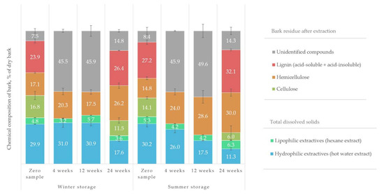 Summary of the overall chemical change in bark samples during the winter and summer storage. Total dissolved solids (both hydrophilic and lipophilic), carbohydrate content (cellulose and hemicelluloses), the amount of lignin and unidentified compounds are shown. The amount of cellulose and lignin was not determined for samples of weeks 4 and 12.