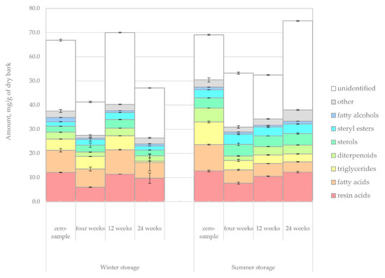 The changes in the amount of lipophilic extractives in the bark samples during winter and summer storage are shown in Figure 4. The average amount of identified lipophilic extractives during winter and summer was around 43 mg/g and 50 mg/g of dry matter. In comparison, approximately 20 mg/g and 23 mg/g of dry matter were left unidentified using chromatographic methods during winter and summer, respectively. Based on the total amount of extractives, no clear trends in the extractives decay could be observed. Instead, the changes that were seen could be understood to reflect the natural variation in the amount of lipophilic compounds between any saw logs of similar outward appearance.