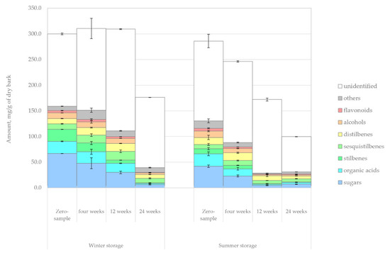 Changes in the amount of hydrophilic compounds (mg/g of dry matter) in saw log bark during summer and winter storage periods. The identification of the extractives group sesquistilbenes is conjectural. It is also possible that this group should be identified as sesquilignans.