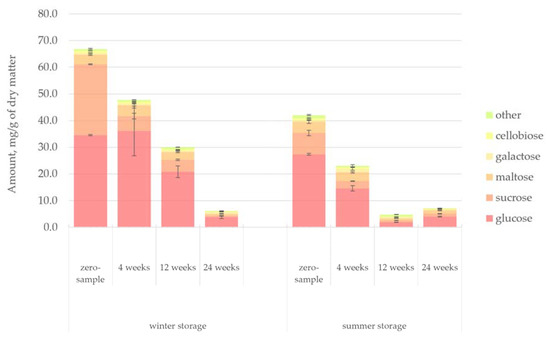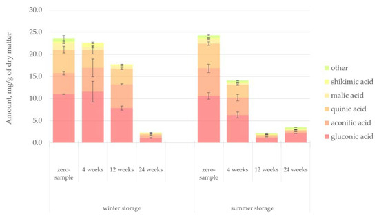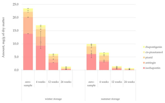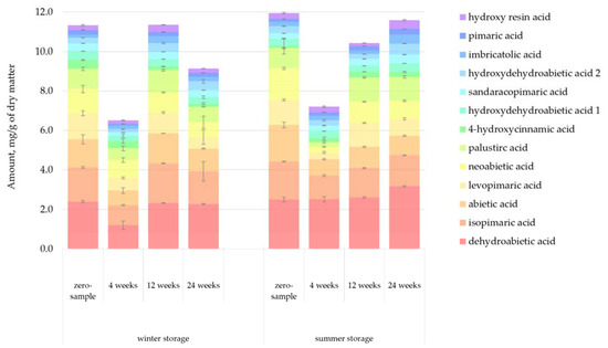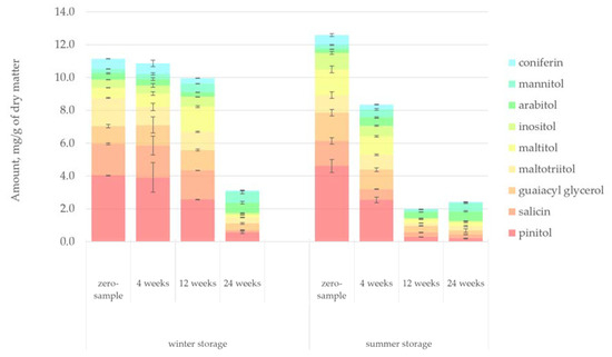 The changes in the amount of hydrophilic compounds during the winter and summer storage periods are shown in Figure 5. Unlike in the case of lipophilic compounds, clear trends were observed for hydrophilic extractives. The total amount of extractives decreased 41% during winter storage and 62% during summer storage. This difference could easily be understood due to the seasonal effects, namely, elevated microbial activity, increased rate of hydrolysis and increased UV radiation during the warm summer months. During summer, the decrease of extractives was immediately noted after 4 weeks of storage, but the extractives content remained high for 12 weeks during winter storage.